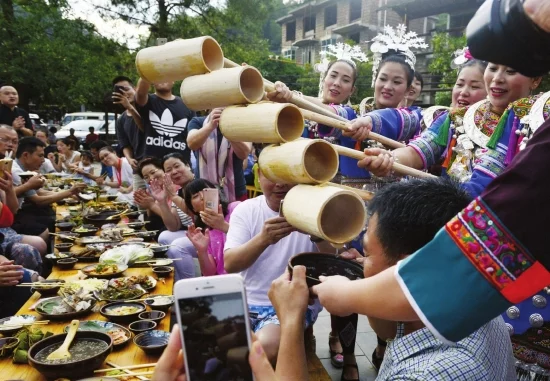 通道縣皇都侗文化村,游客正在體驗村民"高山流水"式的敬酒。圖/吳瑞雄