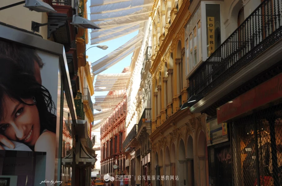 辦完入住手續(xù)從酒店出來(lái)再次來(lái)到街上時(shí),太陽(yáng)已經(jīng)不再那么火辣。為了抵擋白天強(qiáng)烈的陽(yáng)光暴曬,塞維利亞城市中許多街道的上方,都拉起白色的帆布,相當(dāng)人性化的設(shè)計(jì)。事實(shí)上,塞維利亞也一直是一座聚集著眾多工匠、藝人、商業(yè)發(fā)達(dá)的城市,任何時(shí)候都是滿(mǎn)滿(mǎn)的生活場(chǎng)景,這也為劇作家留下了巨大的創(chuàng)作空間。