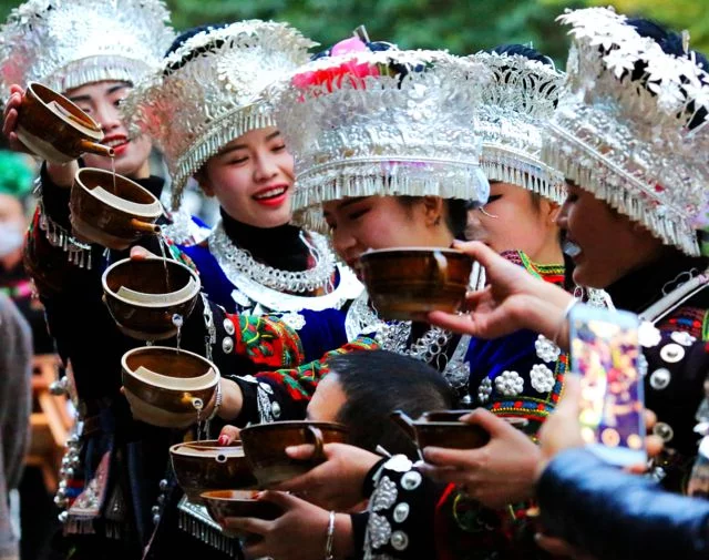 隨著苗民的入場,這里頓時熱鬧起來。大家按著自己的方針找到位置,坐下來。這些苗家的男男女女,也確實是真性情。男生飲酒也就罷了,女生呢,也是圍坐一起,互相舉杯。這也讓我深刻的感受到苗族酒鄉(xiāng)的魅力。不僅如此,這次苗年的主題是全球苗民共慶賀,同時也邀請各位游客一起參與到苗年的狂歡中,所以共飲一杯酒,那是必不可少的。很多游客們邀請拍照,也必須得過酒關,這就是規(guī)矩!
