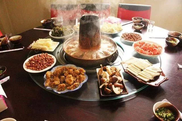 又名大團(tuán)圓。鮮肉骨頭湯煮熟為底料,加上青菜、芋頭、黃筍等,上鋪一層用油泡炸、以冷水浸泡、切成薄片的豬皮,點(diǎn)綴一圈蛋卷,即成一色香味俱佳的土火鍋。其味道鮮美自不必說